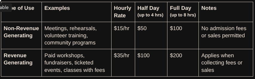 Rates for registered non-profit groups are divided into non-revenue and revenue-generating activities.