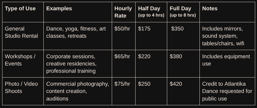 (Studio not available during regularly scheduled Atlantika Dance programs)